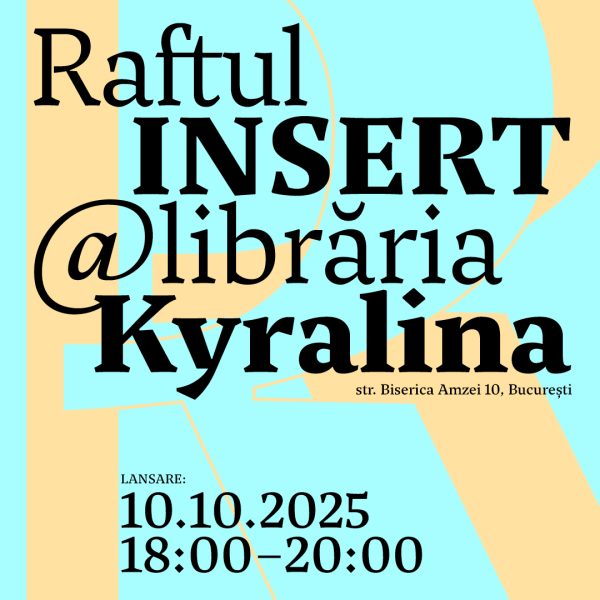 Librăria Kyralina prezintă începînd din 10 octombrie un raft dedicat INSERT – Platforma cărții de artă din România, coordonat de Institutul Prezentului. Raftul include o selecție de cărți dedicate artiștilor români și carte de artă românească publicate, între alții, de Galeria Posibilă, P+4 Publications/ Institutul Prezentului, Editura MNAC, /SAC & Editura Vellant, Paper Traffic, Salonul de proiecte, Editura IDEA.