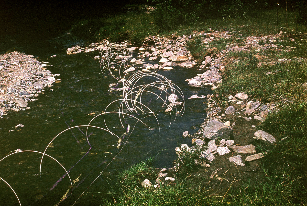 The configuration of complex architectural-visual spaces is continued by the Sigma Group at the Cibinium Festival (Sibiu, 1973) and at the exhibition Art and Energy (New Gallery, Bucharest, 1974) with a space woven and modelled with colourful threads and strips (Ștefan Bertalan), a rhythmic space structured from hexahedral networks, bars, hexagons, strips (Doru Tulcan, Ioan Gaita), knots and spatial bodies resulting from the study of the joining of prismatic triangular and pentagonal surfaces (Constantin Flondor). Spatial architectures become ephemeral structures in the Inflatable Structures environment from the Bastion Gallery (UNESCO Fine Arts Week, 1974), where slides and films are projected over inflated tubular and spherical transparent forms. Gradually, spatial experiments are transferred to the landscape. The land art interventions of the Sigma Group at the Timiș river, as well as the interventions made with the students during the summer camps practices enhance the topics.