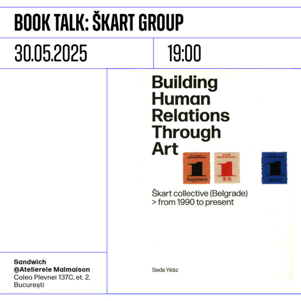 Škart Group’s workshop in Bucharest features a public event dedicated to the publication “Building Human Relations Through Art. Škart collective (Belgrade) > from 1990 to present” (Onomatopee 224, 2022), with the participation of the artists and of the curator and book editor, Seda Yildiz.